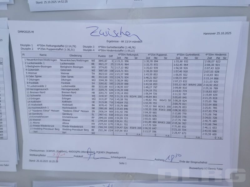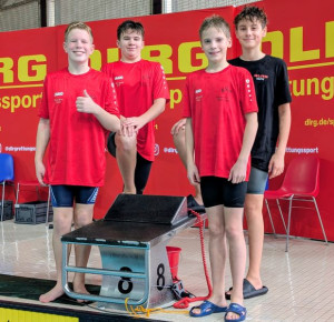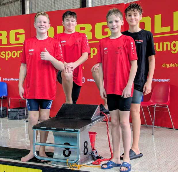 Das Highlight für unsere Ortsgruppe waren die Wettbewerbe der Altersklasse 13/14 männlich, die im schnellsten Lauf schwammen und sich einiges vorgenommen hatten. Alle Mannschaften mussten in vier unterschiedlichen Staffeln an den Start gehen, die Punkte aller vier Rennen zählten anschließend zusammen. Unsere Jungs gewann die ersten beiden Staffeln, die Rettungsstaffel und die Puppenstaffel, souverän, beide nur Wimpernschläge über dem deutschen Rekord. Bei der dann folgenden Gurtretterstaffel folgte allerdings Ernüchterung: Die Mannschaft aus Luckenwalde war fast 3 Sekunden schneller. So war klar: Diejenige dieser beiden Mannschaften, die bei der Hindernisstaffel schneller sein wird, würde auch den Titel holen. Nach dem zweiten Schwimmer lag unser Team auf Platz 6 von 8, etwa 10 Meter hinter den Führenden, der Titel war eigentlich schon verloren. Jannis Schinor, als 3. Schwimmer, führte das Team aber wieder näher heran und Henning Rösler machte das Unmögliche möglich und schlug 23 Hundertstel vor Luckenwalde an. “Das war kurz vor Herzinfarkt", sagte Trainer Felix Gehring.